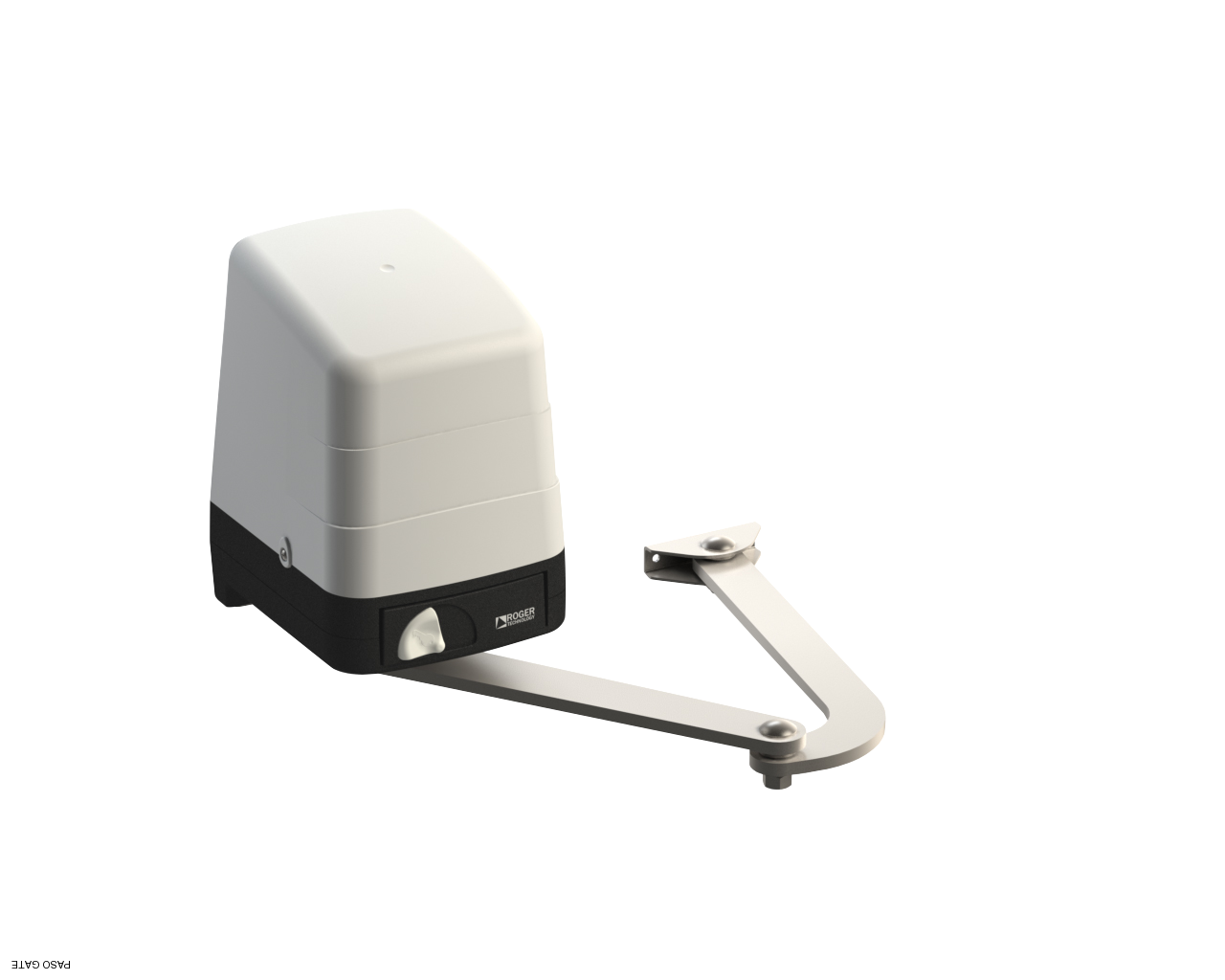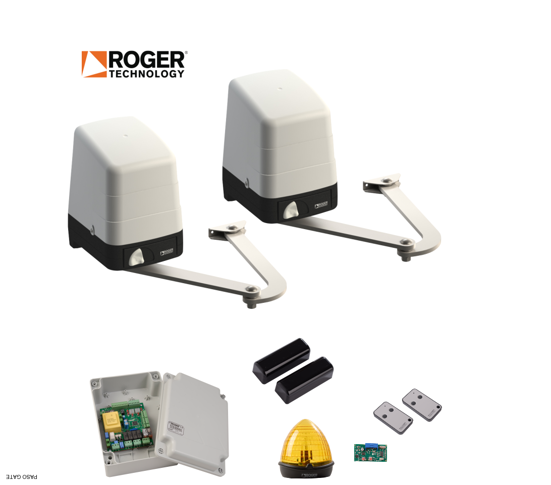 Kit de automatizare de la ROGER TECHNOLOGY pentru porti batante cu stalpi mari. Automatizarea permite deschiderea a portilor cu canate de 3m.